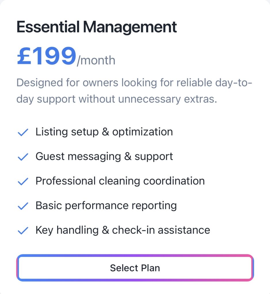 The Essential package (£199 per month) provides core setup and operational services, including property onboarding, guest correspondence, housekeeping coordination, and standard performance summaries.