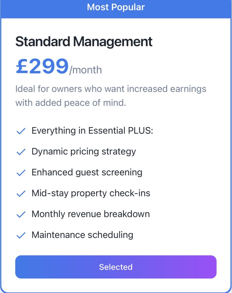 The Standard package (£299 per month) expands on this by incorporating intelligent rate management, improved guest verification procedures, and organized maintenance oversight.