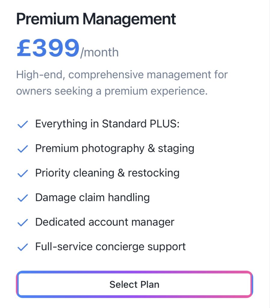 The Premium package (£399 per month) delivers a comprehensive, white-glove experience, offering all Standard features alongside professional photography, a dedicated account manager, and end-to-end concierge services.